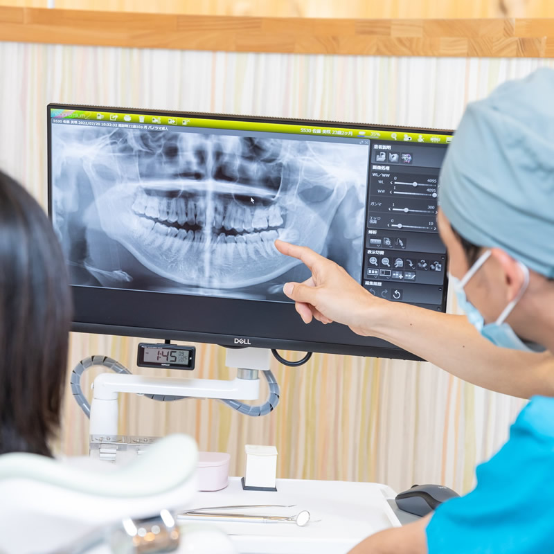 実際にレントゲン画像や口腔内写真などの検査結果をご覧いただきながら分かりやすく説明して、患者さまに納得いただいてから治療を進めてまいります。
